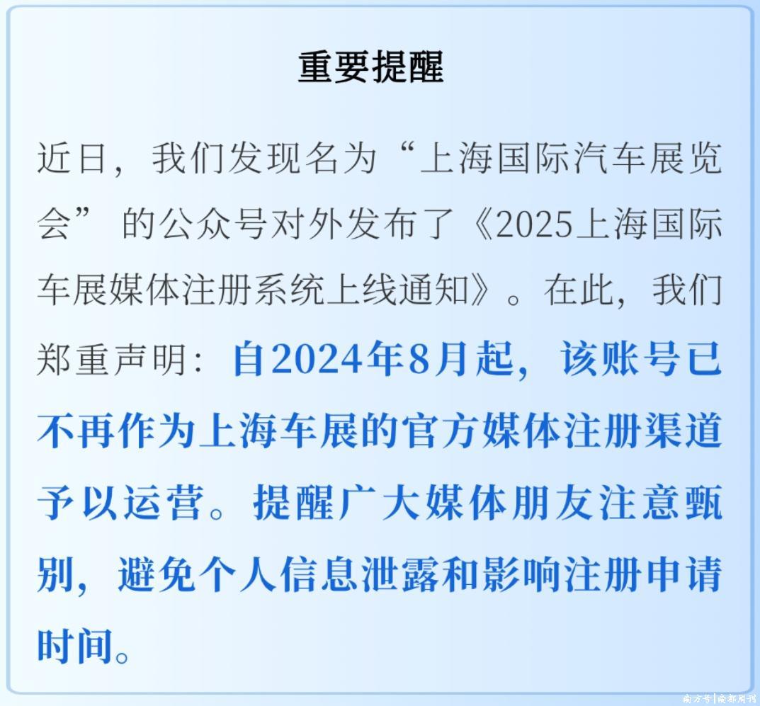 继双方公众号分别发布媒体注册通知后,3月24日,“上海国际汽车工业展览会官微”发布《重要提醒》。其声明称,自2024年8月起,“上海国际汽车展览会”已不再作为上海车展的官方媒体注册渠道予以运营,并提醒广大媒体朋友注意甄别,避免个人信息泄露和影响注册申请时间。