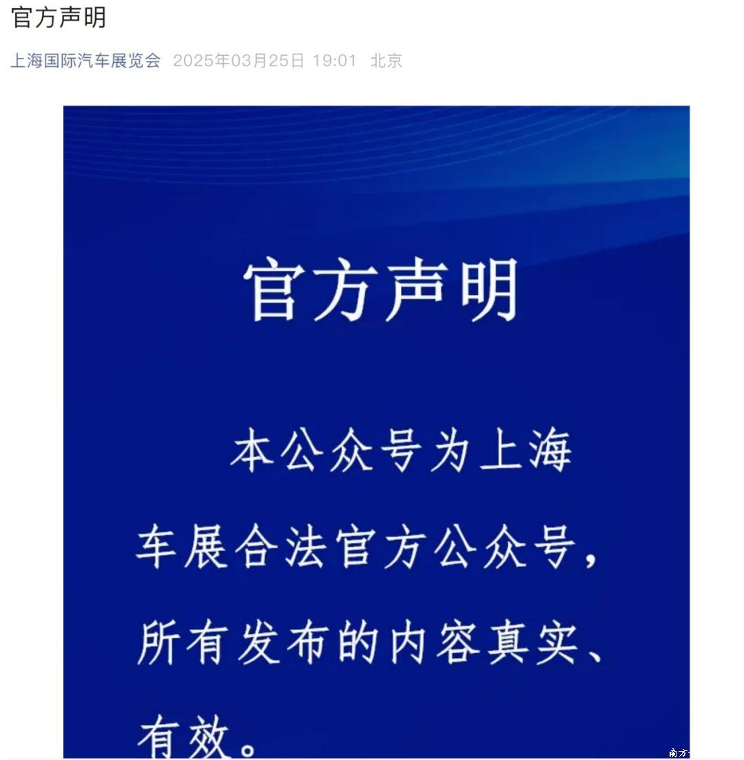 然而,3月25日,“上海国际汽车展览会”发表《官方声明》予以回应,称此公众号为上海车展合法官方公众号,所有发布的内容真实、有效。