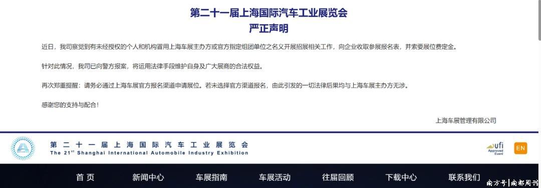 《声明》指出,近日该司察觉到有未经授权的个人和机构冒用上海车展主办方或官方指定组团单位之名义开展招商相关工作,向企业收取参展报名表,并索要展位费定金,对此情况,该司已向警方报案,将运用法律手段维护自身及广大展商的合法权益。