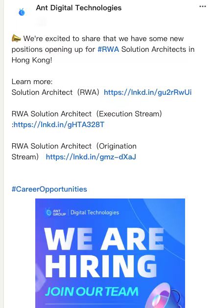 新浪科技讯 9月20日下午消息,新浪科技获悉,蚂蚁数科海外社交媒体发布多个RWA架构师岗位,岗位base地均在香港。